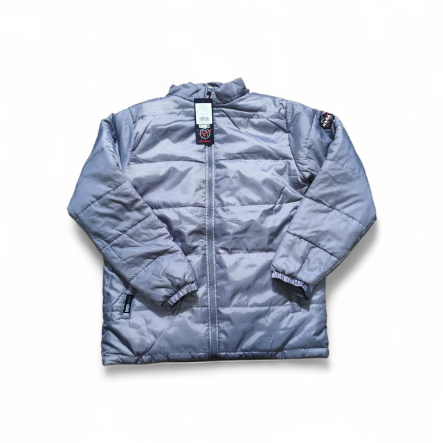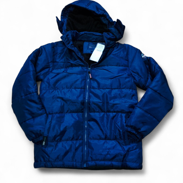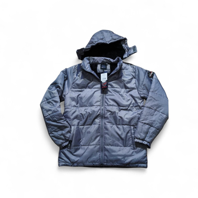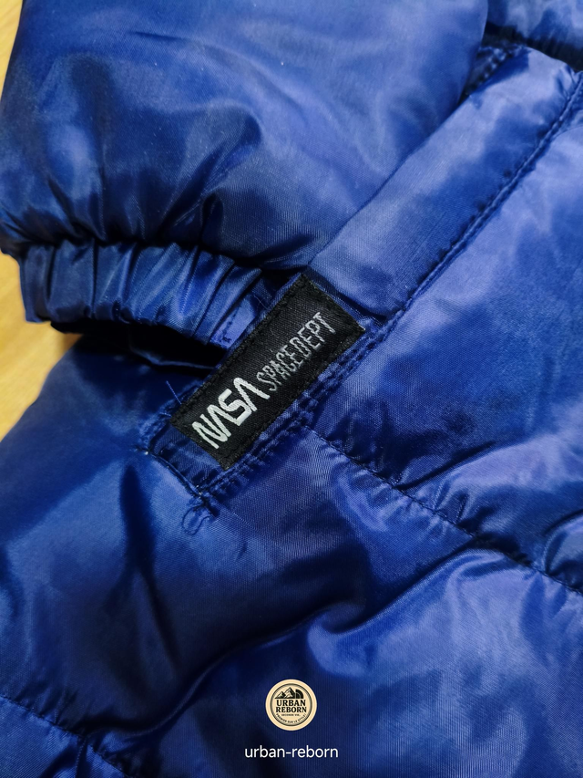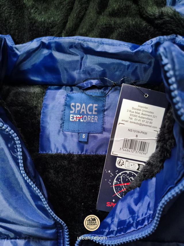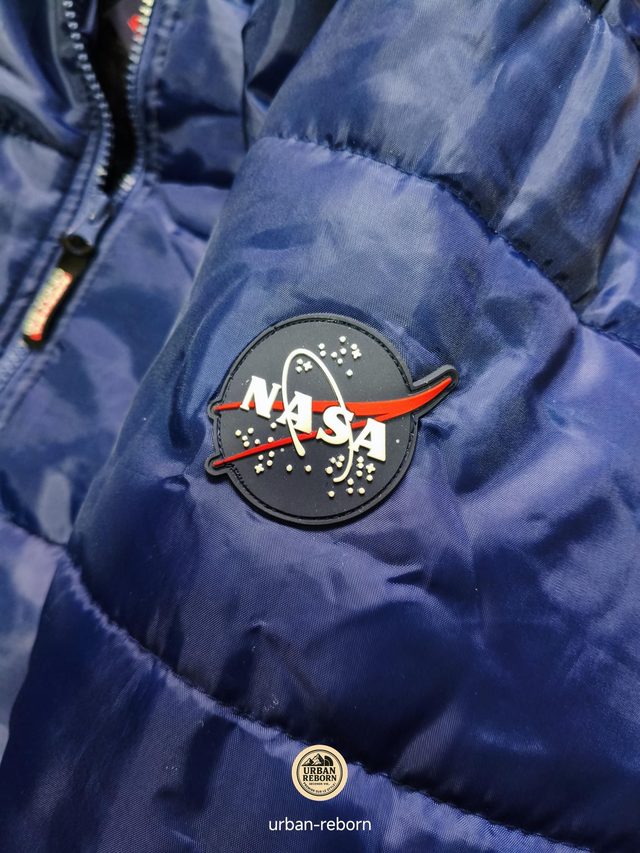 Doudoune NASA avec doublure en fourrure et capuche amovible, chaude et confortable, disponible en gris et bleu.